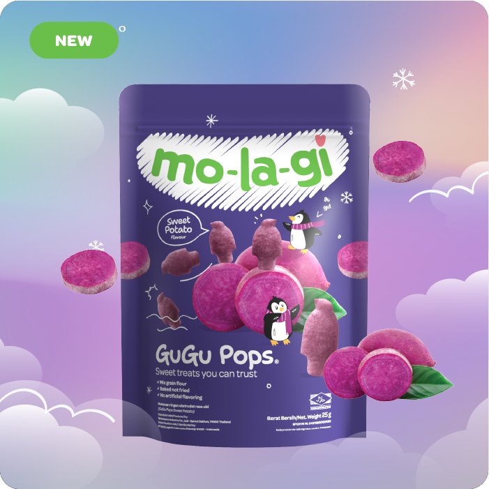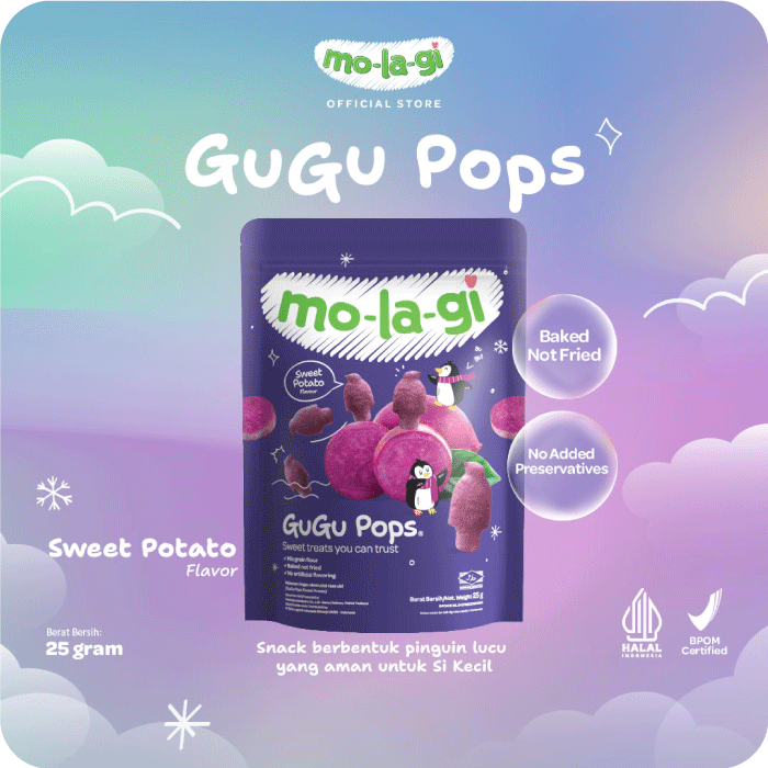 Manis alami ubi ungu berpadu dengan kerenyahan namun mudah lumer di mulut Si Kecil, menjadikan Molagi Gugu Pops Sweet Potato sebagai camilan sehat pilihan untuk si kecil. Terbuat dari bahan alami tanpa tambahan gula dan garam, camilan ini membantu bayi mengenal rasa alami sambil melatih keterampilan makan mereka. Ringan, renyah, lumer, dan bergizi—karena setiap gigitan pertama layak jadi momen berharga. Camilan manis namun sehat ini terbuat dari Beras Merah dan Bulir Jagung. Sehingga Gluten Free dan Dairy Free.