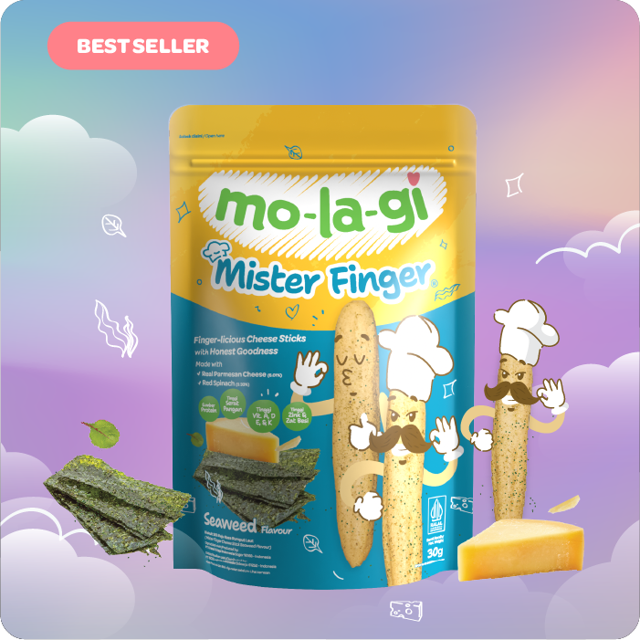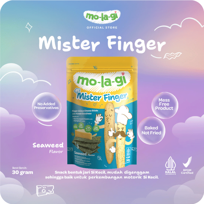 Camilan stik gurih dengan rasa keju parmesan asli Australia berpadu dengan rasa khas seaweed, dibuat dari bahan berkualitas untuk menemani momen bermain dan belajar si kecil. Teksturnya ringan dan mudah digenggam, membantu melatih motorik makan sambil memberikan asupan nutrisi dari bahan alami. Molagi Mister Finger – Original, teman ngemil sehat yang simpel namun tetap penuh manfaat.